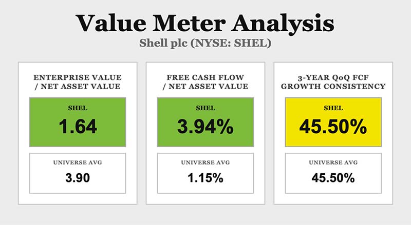 Shell’s EV/NAV ratio is 1.64, compared with a broad market average of 3.9. That means the stock trades at about a 58% discount to the broader market on an asset basis.