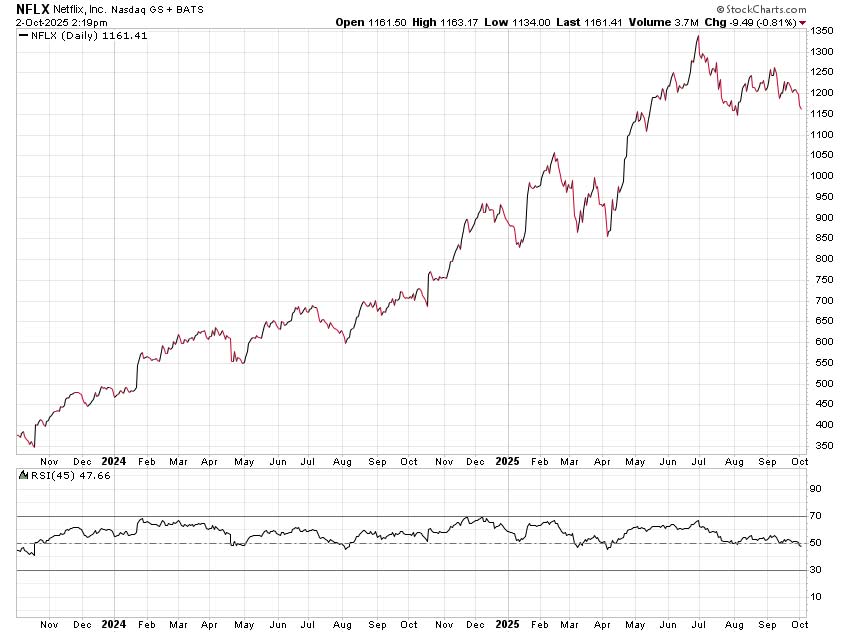 You can see at the bottom of the chart that Netflix’s 45-day relative strength index (a metric I recently analyzed for Oxford Club Members in The Oxford Insight) is below 50 right now. Readings under 50 tend to signal good buying opportunities from a strictly technical perspective.
