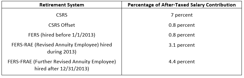 Both CSRS/CSRS Offset and FERS employees contribute to their respective retirement systems via payroll deduction. Each pay date, a portion of the employee’s after-tax salary is contributed to either the CSRS Retirement and Disability Fund or the Federal Employees Retirement and Disability Fund. The following table summarizes what percentage of the employee’s after-tax salary is contributed:
