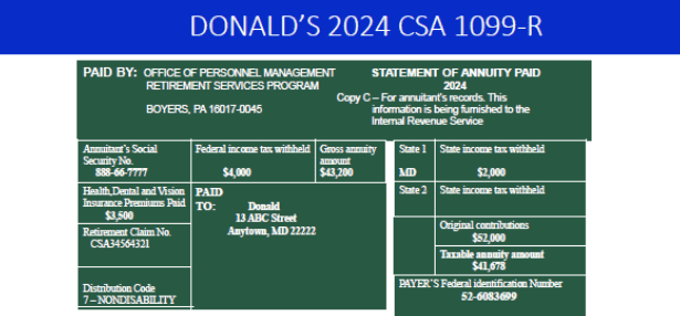 Donald, a FERS-covered employee, retired from federal service on November 30,2023 under a FERS annuity that provides a full 50 percent survivor benefit to his wife, Kathy. Donald’s first annuity check was dated January 1, 2024. Donald ‘s 2024 CSA 1099-R is shown below. Donald uses the Simplified Rule to determine the tax-free portion of his FERS annuity that he received during 2024.