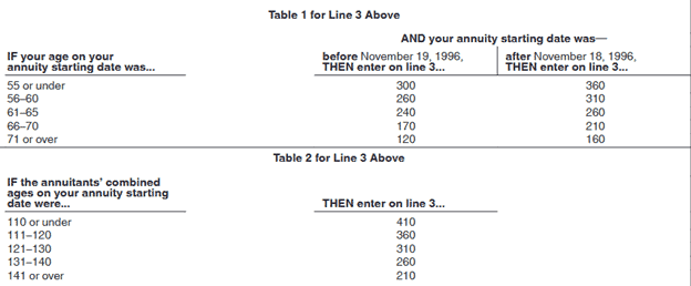 • Line 3. An annuitant must choose a life expectancy factor that depends on the following: (1) The annuity starting date, before November 19,1996 or after November 18, 1996; (2) Whether the annuitant is giving a survivor annuity to one person. If the annuitant is giving a survivor annuity to one person, the total of the combined ages of the annuitant and survivor annuitant in the month/year the annuitant receives his or her first CSRS or FES annuity check; and (3) The age of the annuitant in the year he or she will receive his or her first CSRS or FERS annuity check.