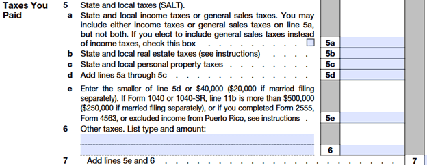 Those individuals who want to report foreign taxes paid as an income tax deduction may do so as an itemized deduction on IRS Form 1040 Schedule A (Taxes You Paid) Line 6 (“Other taxes”) as shown here: