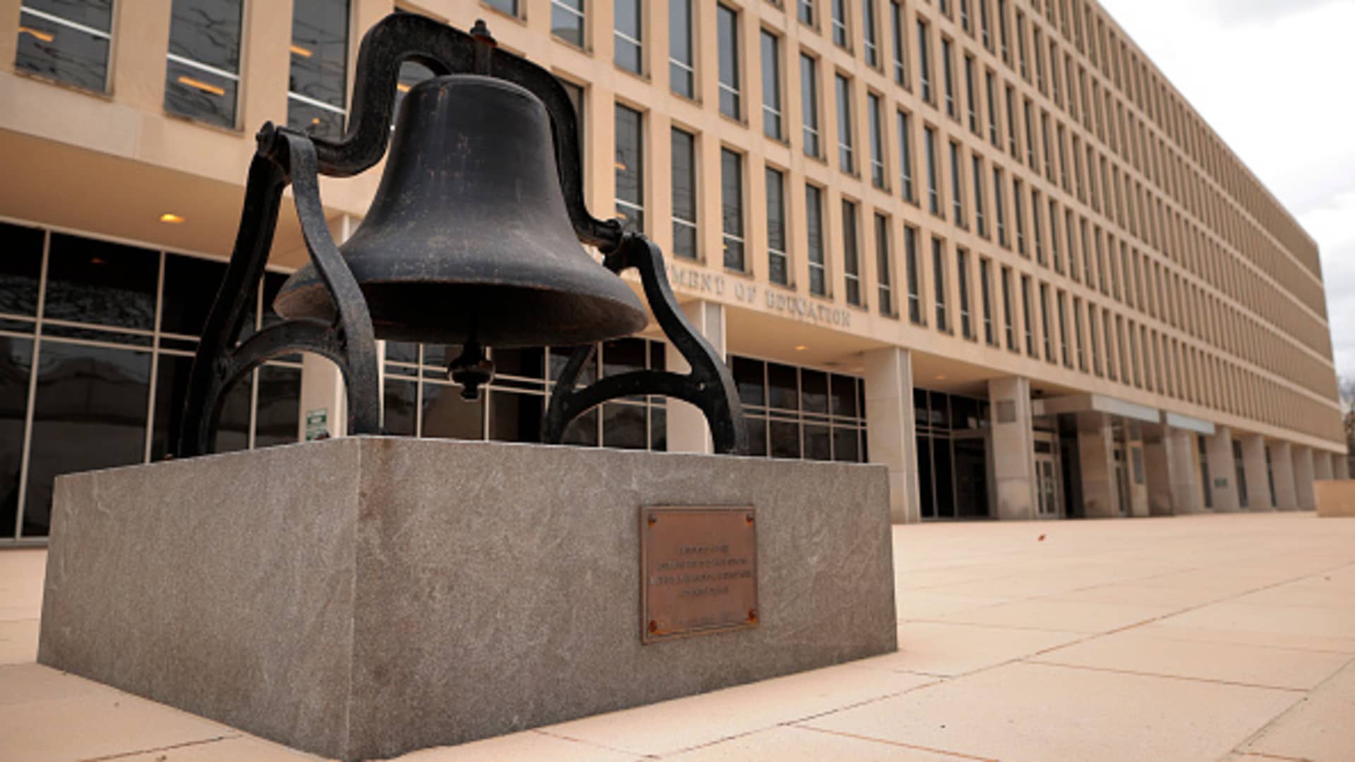 A school bell from Milford, Pennsylvania, stands in front of the Department of Education’s headquarters in Washington, March 6, 2025.