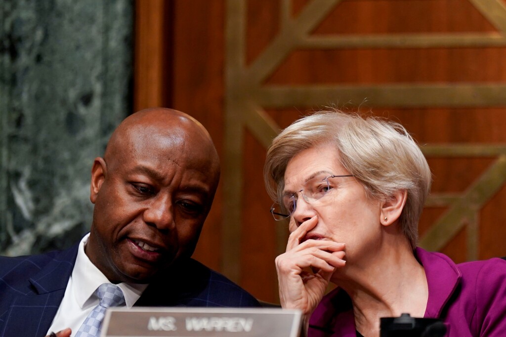 Senate Banking Committee Chair Tim Scott, R-S.C., and committee ranking member Elizabeth Warren, D-Mass. The committee will mark up a stablecoin bill Thursday morning that has drawn growing concern from the banking industry.