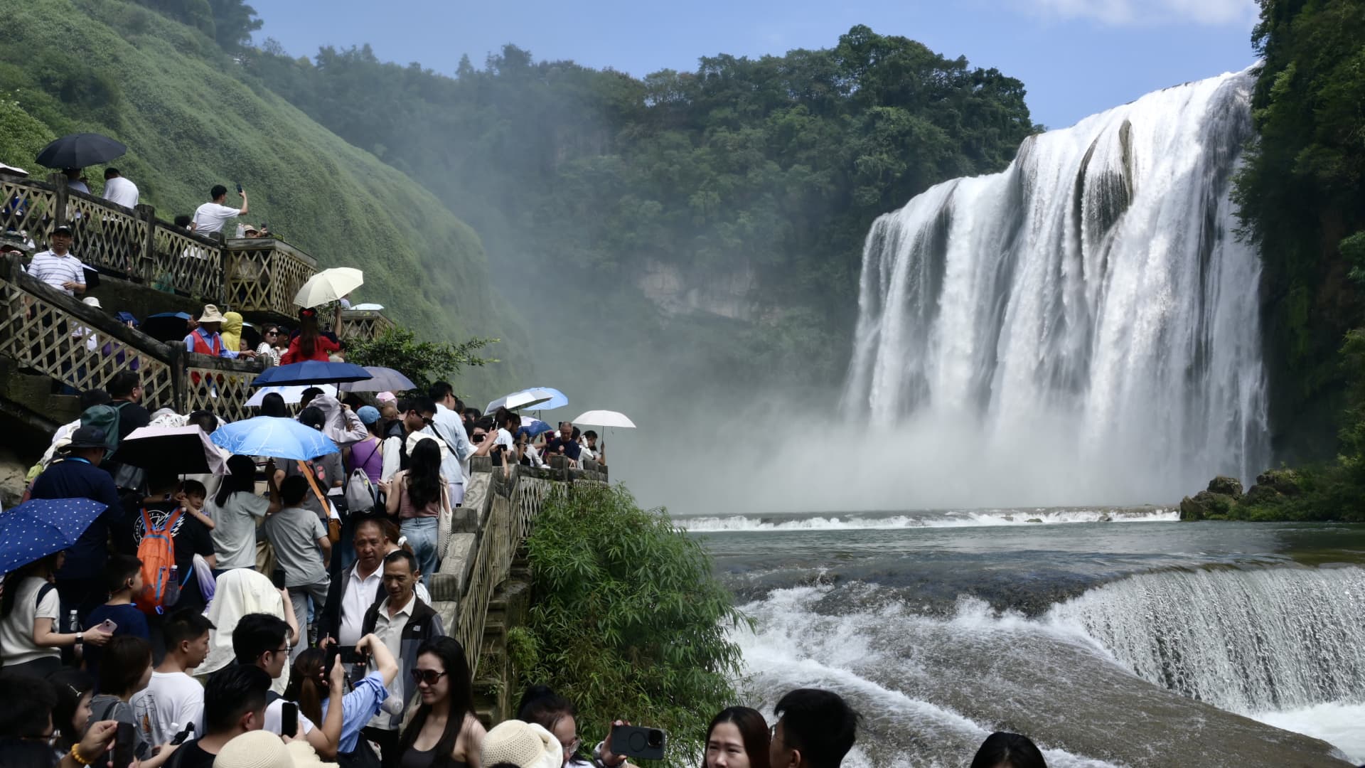 Tourists visit the Huangguoshu Waterfall of “Monkey King” fame in China’s Guizhou province on Oct. 5, 2025, during a week-long public holiday.